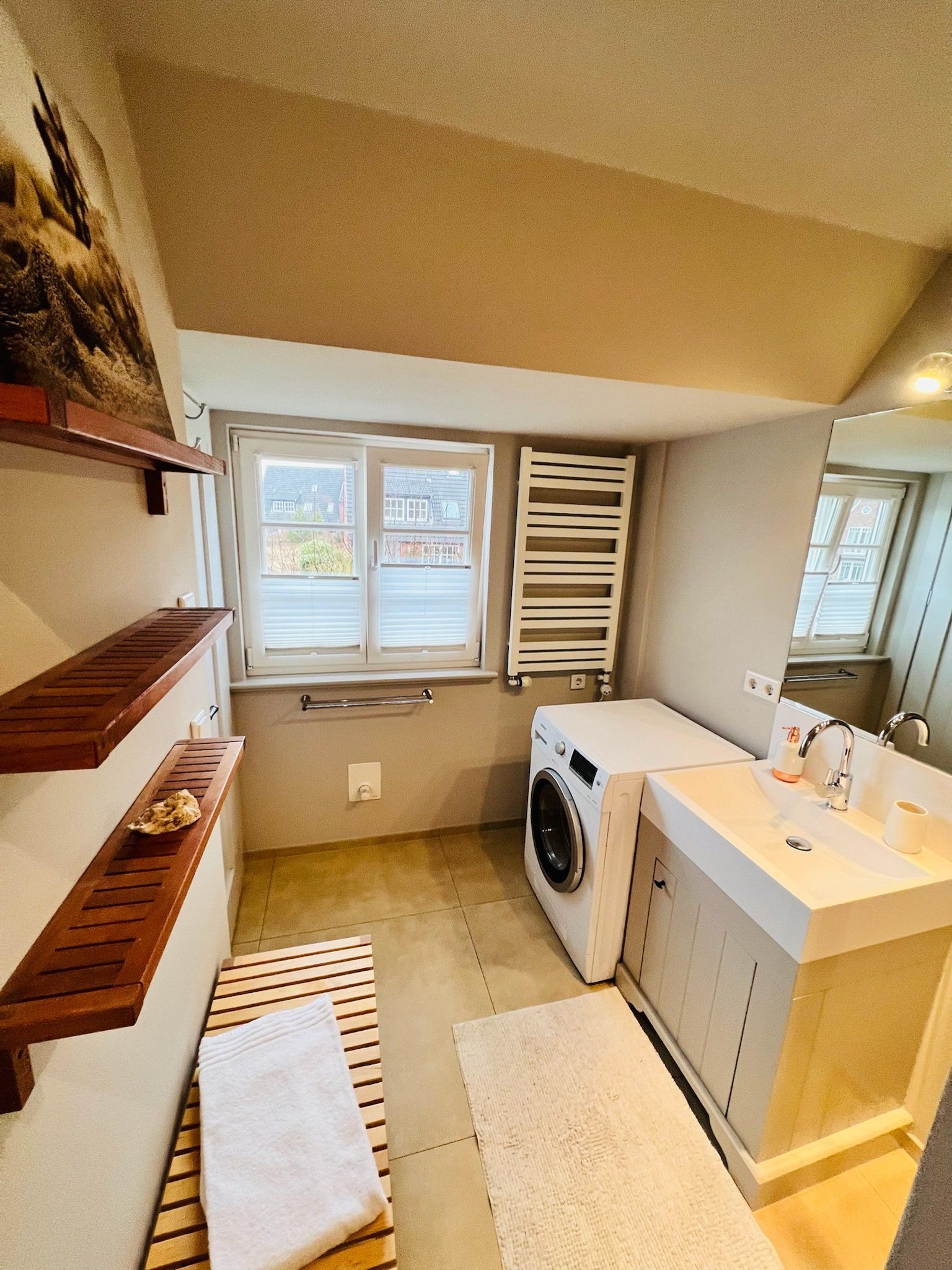 In der Wohnung steht ein eigener Waschtrockner kostenlos zur Verfügung